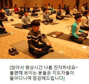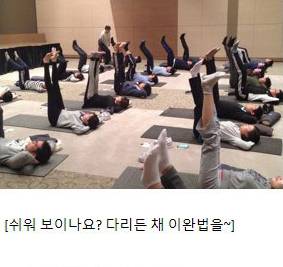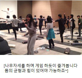 - 2015년 2월 6일 1년차 신입사원 리더십 교육 중 진행한 명상요가 프로그램에 대한 만족도가 좋았다며 다시 해달라는 요청을 받았어요. 한 번 출강 간 곳에서 또 다시 재요청이 들어 오는 것은 참 기분 좋습니다. 이번에 3개월 수습기간이 끝나고 정식 사원이 되는 분들이 대상이었어요. 가장 어린 분은 19살? 역시나 생기가 돌아서 즐거운 수업이었습니다. 이제 신입 사원인데도 어릴 적부터 운동량은 적고 고정된 자세로 오래 있어서 체형도 많이 틀어지고 긴장도 많았어요. 그래서 특히 잠잘 때까지 놓지 않는 스마트폰 중독과 위험에 대해 알려드렸습니다. 그리고 앞으로 오랜 세월 일하기 위해서는 잘 쉬어줘야 하는데, 진정한 쉼이란 어떤 것인지 체험하는 시간을 가졌어요. [ 지도자 한마디 ] 한 분, 한 분과 대화를 나누듯 편하고 즐거운 시간이었어요. 마치고는 "별것 안 한 것 같은데 어깨가 다 풀어졌어요." 라는 말씀에 저절로 미소가 지어졌습니다. 또다시 참여하고 싶다고 하는 분이 있어서 행복했습니다.