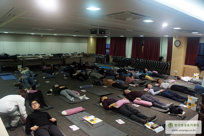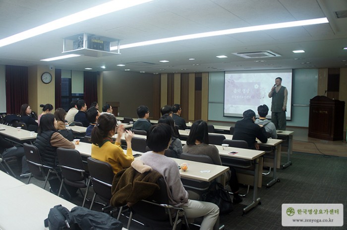 - 첫째날. 정도현 지도자의 음악명상 강의. 음악 소리를 따라 복잡한 마음을 쉬게 하여 편안한 마음을 체험하게 하는 강의였습니다. 둘째날. 위한 지도자와 박수민 지도자의 science of pillow program. 과도 한 업무로 인하여 중추신경 긴장상태에 있는 현대인에게 베개이완을 통한 심신일체 명상법으로 휴식을 체험하게 하는 시간이었습니다.